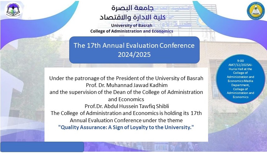 Under the patronage of the President of the University of Basrah, Prof. Dr. Muhannad Jawad Kadhim, and the supervision of the Dean of the College of Administration and Economics, Prof.Dr. Abdul Hussein Tawfiq Shibli, the College of Administration and Economics is holding its 17th Annual Evaluation Conference under the theme
