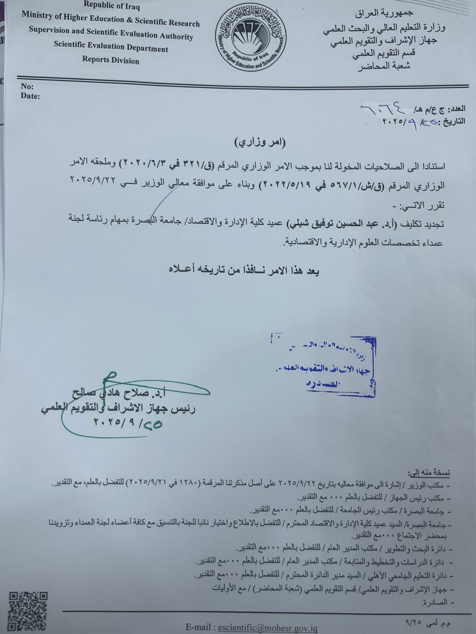 THE MINISTER OF HIGHER EDUCATION AND SCIENTIFIC RESEARCH RENEWS THE APPOINTMENT OF PROFESSOR DR. ABDUL HUSSEIN TAWFIQ SHIBLI: