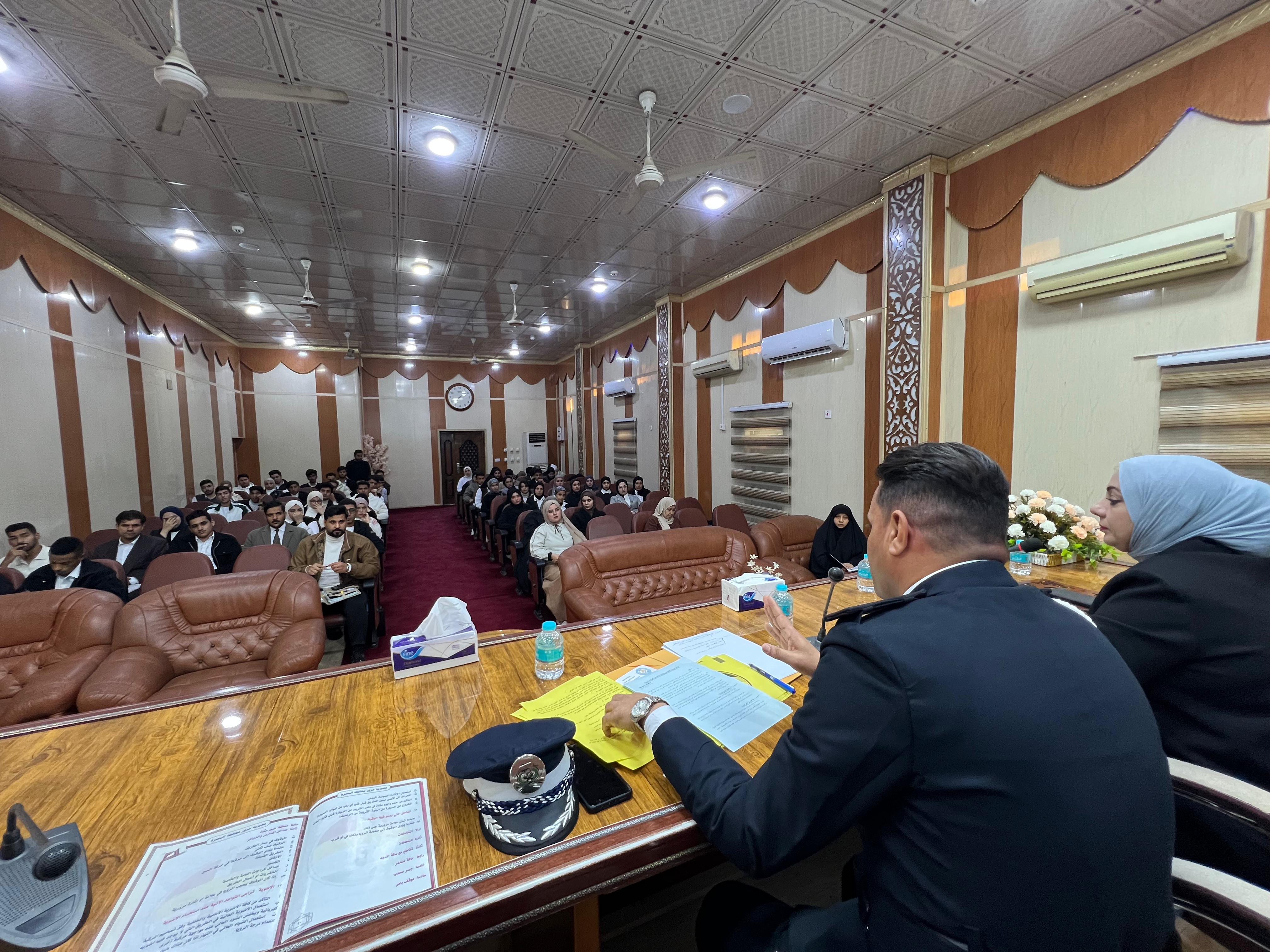 The workshop, presented by Lieutenant Colonel Jamal Nasser Rashid from the Basra Governorate Traffic Directorate, covered driving ethics, legal rules, causes of accidents, traffic safety, and psychological effects.