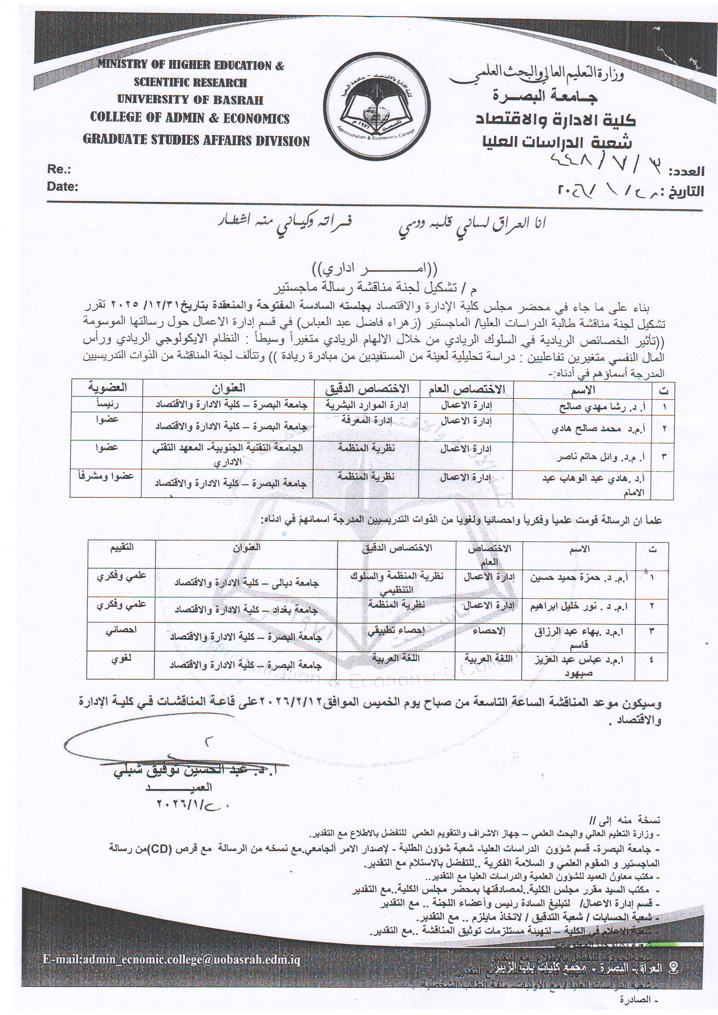 Formation of the Thesis Defense Committee for the Graduate Student / Master’s (Zahraa Fadhil Abd Al-Abbas)